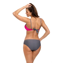 Zdobí je půvabný vzor malých motýlů doplněný hladkou látkou. Horní část podprsenky s kontrastním lemováním. Střih s vyztuženými košíčky, kosticemi a push-up výplní dokonale opticky zvětšuje prsa a zároveň je dobře shromažďuje a udržuje ve správné poloze, takže dekolt vypadá velmi atraktivně. Push-up je součástí každé velikosti plavek a není možné jej z podprsenky vyjmout. Doplněné o tvarované, pohodlné, lehce vzorované kalhotky. Italská tkanina. Styl inspirovaný sportem. Složení: 80 % polyamid, 20 % elastan.