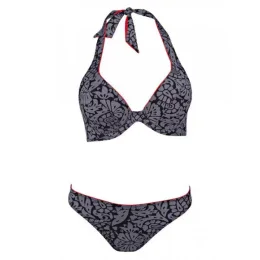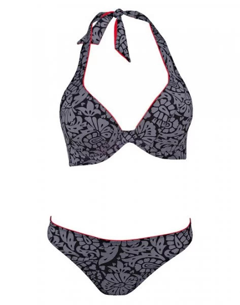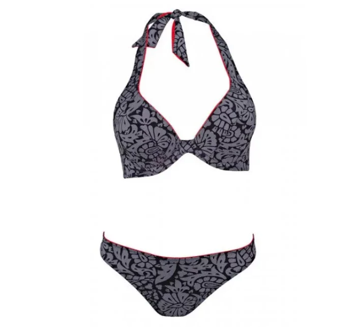 Dámské plavky 8710 - Anita dvoudílné,nevyztužené s kosticí,vázání za krk,v barvě černošedé s motivem květin.Ramínka ,taktéž kalhotky v pase lemovány červenou barvou.Materiál 80% polyamid,20% elastan.