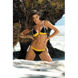 Módní dvoudílné plavky ve stylu bikin s vyztuženými košíčky a pevnými (nevyjímatelnými) push-up košíčky. Košíčky jsou skvěle tvarované, nadzvedávají a opticky zvětšují prsa a vytvářejí svůdnou linii dekoltu. Dvě látky, hladká a lehce reliéfní, jim dodávají zajímavý charakter a odlišují je od ostatních. V pase se zapínají na přezku. Spodní část se pohodlně zavazuje na obou stranách boků - to nejlepší. Celek působí elegantně, žensky, sexy a moderně. A dokonale zdobí tělo. Vřele doporučujeme!