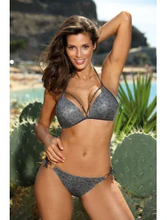 Podprsenka vychází ze střihu sexy bardotky, s vyztuženými košíčky a velkým push-up efektem okamžitě sbírá, zvedá a opticky zvětšuje ňadra, takže dekolt je obzvlášť atraktivní. Elastický obvod, pohodlně zavazující se na zádech. U krku módní ozdobný pásek s bižuterií, který lze v případě potřeby z modelu zcela odepnout a rovnoměrně tak opálit tělo. Hladká látka podprsenky se skvěle hodí ke vzorovaným, barevným kalhotkám na tenkých "elastických" ramínkách, na bocích. Jejich střih svádí sexy linií, která krásně zvýrazňuje boky a nohy vypadají delší, než ve skutečnosti jsou... Sexy! Střih je díky elastickým ramínkům na bocích velmi pružný.