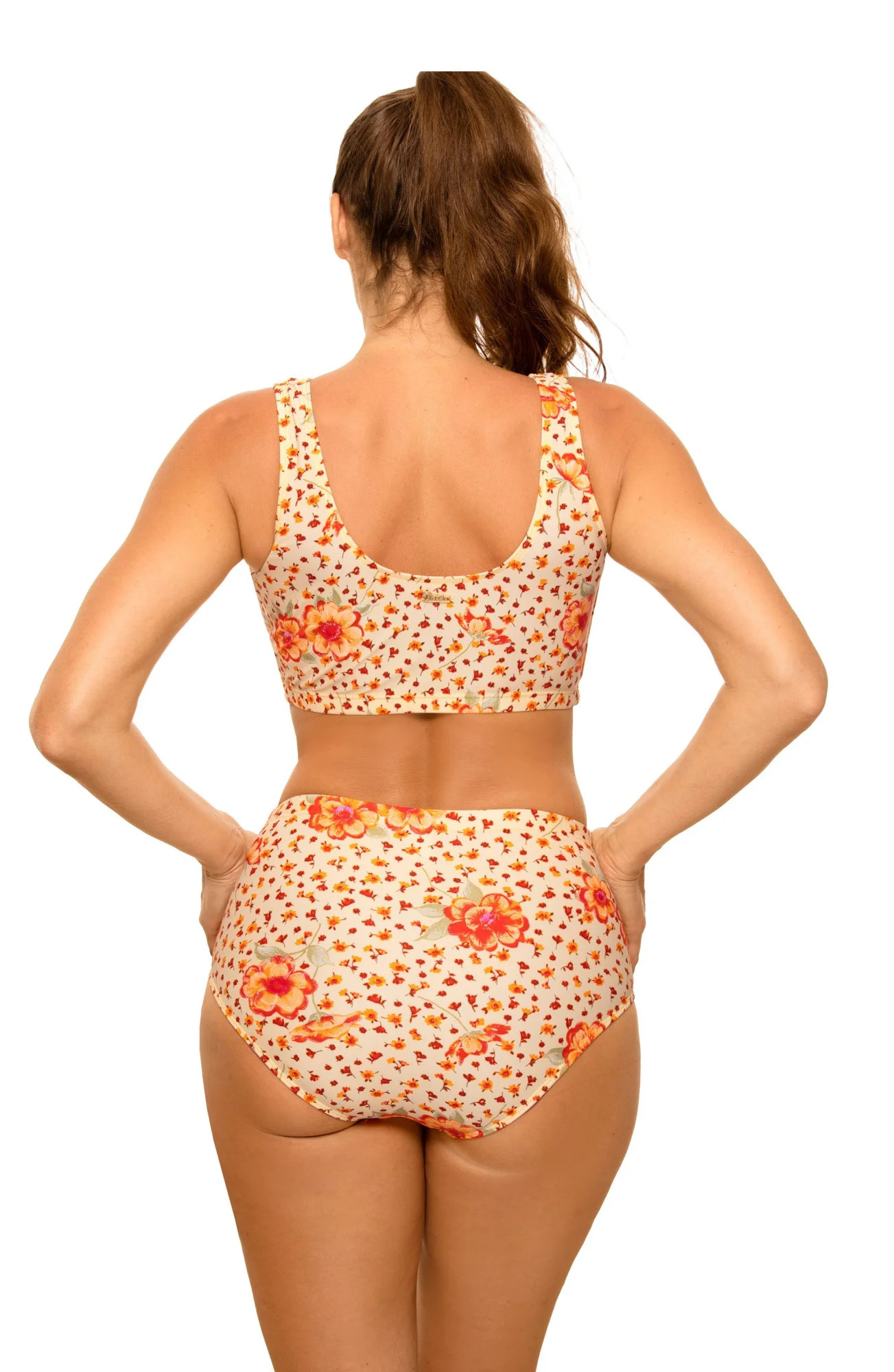 Velikost kostýmu | Obvod poprsí, na které podprsence leží nejlépe | Obvod pod prsy | Obvod boků (na něm kalhotky leží nejlépe) | Výška fíků (přední/zadní) | Šířka dna měřeno naplocho | Pružnost tkaniny | Horní délka |