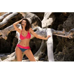 Podprsenka s košíčky vyztuženými jemnou pěnou, s push-upkou umístěnou trvale v modelu (nelze vyjmout), pěkně shrnuje prsa, přibližuje je k sobě a opticky je zvětšuje, čímž zároveň vytváří hluboký, smyslný dekolt. Ramínka uprostřed tento sexy dojem umocňují. Push-upka je přítomna v každé velikosti modelu. Podprsenka se zavazuje za krkem i na zádech. Součástí kompletu jsou kalhotky s ozdobným zavazováním na bocích, vkládané tradičně (zavazování je ozdobným prvkem). Elegantní barvy, které dokonale ladí s letním klimatem.