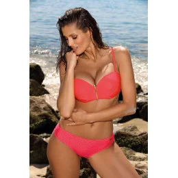 Elegantní kostým s nádechem sváteční atmosféry, který obsahuje hladkou podprsenku, uprostřed mírně staženou, s krásnou zlatou broží a samozřejmě velkou push-upkou, spojenou se sexy brazilskými kalhotkami.