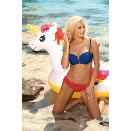 Elegantní kostým s nádechem sváteční atmosféry, který obsahuje hladkou podprsenku, uprostřed mírně staženou, s krásnou zlatou broží a samozřejmě velkou push-upkou, spojenou se sexy brazilskými kalhotkami.