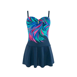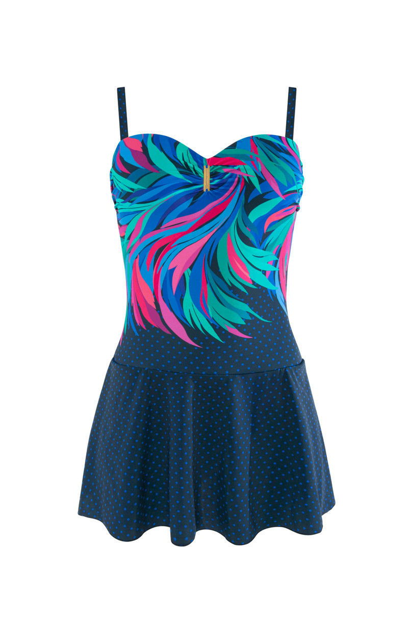 Vyjímatelné vycpávky umožňují individuální tvarování prsou a vysoce kvalitní materiál (85 % polyamid, 15 % elastan) zaručuje pružnost, trvanlivost a odolnost vůči UV záření a chlóru. Barevný tropický vzor v kombinaci s klasickým střihem vytváří stylový vzhled ideální na pláž, k bazénu nebo na prázdninové výlety.