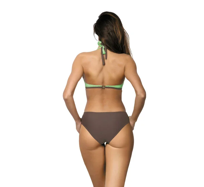 Horní díl plavek je spojen se spodním širokým, pěkně střiženým páskem, který zakrývá bříško. Zadní díl plavek vypadá jako dvoudílný a zapíná se vzadu na přezku. Měkké pěnové vycpávky košíčků jsou ve spodní části vyztužené, díky čemuž prsa vypadají větší a opticky zdvižená. Na bocích jsou vyztužené kostice. Ramínka se zavazují za krkem, zdobí je brože ve stříbrné barvě. Na bocích je pásek, rovněž s broží. Obě barvy (které k sobě dokonale ladí) působí svěže, módně a dovolenkově. Ideální na pláž.