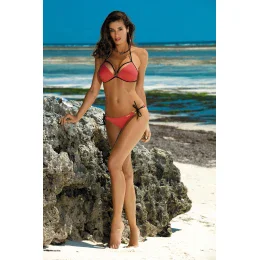 Hladké dvoudílné plavky jsou ušité z italské látky, s ramínky ve výstřihu, ve skvělých barvách, svůdné a ženské. Podprsenka je zespodu vyplněná speciální pěnou a obohacená o push-up výplň (neodnímatelnou) - shrnuje prsa do výstřihu, nadzvedává je a opticky zvětšuje. Uprostřed je brož. Podprsenka se zavazuje na zádech i za krkem. Kalhotky se také zavazují na obou stranách, jsou velmi pohodlné. Vynikají krásnými bižuterními kroužky po stranách. Velmi půvabně zdobí boky.