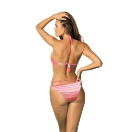 Krásné dvoudílné plavky s dobře tvarovanými košíčky. Takový, který vytváří lákavý výstřih. Košíčky skvěle sbírají prsa, dobře je tvarují a zároveň vytahují nahoru. Z vnitřní strany jsou polstrované a obohacené o trvale zabudovanou push-up výplň (k dispozici ve všech velikostech) s bočními velrybími kostmi. Pěkné lemování okamžitě upoutá pozornost. Popruhy s broží, elegantní, uvázané na krku. Obvod je pohodlně svázán na zadní straně. Základem je jemně nařasená látka, která podtrhuje jedinečný charakter kostýmu. Kalhotky s přídavným páskem, který obepíná boky. Měkké, s podšívkou.