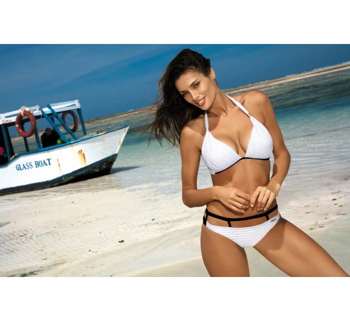 Krásné dvoudílné plavky s dobře tvarovanými košíčky, které vytvářejí svůdný dekolt. Košíčky jsou dobře vybarvené pro prsa, tvarují je a zároveň je vypínají. Košíčky jsou z vnitřní strany vyztužené a obohacené o vestavěnou push-up výplň (k dispozici ve všech velikostech), s bočními velrybími kosticemi. Krásné lemování okamžitě upoutá pozornost. Ramínka s broží, elegantní, zavazují se za krkem. Pas se pohodlně zavazuje na zádech. Ve spodní části - jemně nařasená látka, která podtrhuje výjimečnost plavek. Kalhotky s přídavným páskem, který obepíná boky. Měkké, podšité.