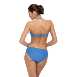 Podprsenka v tzv. "podprsenkovém" designu. "Bandeau", má vyztužené košíčky (bez push-up) obohacené kosticemi, takže pěkně tvaruje linii dekoltu a udržuje prsa ve správné poloze. Střih pěkně shrnuje poprsí, což se skvěle hodí na pláž. Popruh přes krk, odnímatelný. Kostým má elastický lem se zavazováním na zádech. Kalhotky jsou velmi pohodlné, vpředu s ozdobným páskem, zdobeným šperkem. Kostým je celý ušitý z vysoce kvalitní italské látky a působí velmi elegantně. Vyberte si ji a dovolená bude jistě úspěšná! Složení: 80 % polyamid, 20 % elastan.