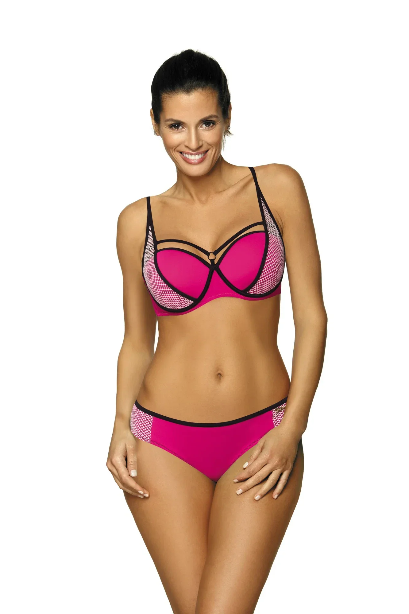 Plavky nádherně zdobí tělo a zároveň vypadají mimořádně zajímavě a poutavě. Ramínka, "síťované" boky, kontrastní zdobení a krásné barvy jsou největšími přednostmi tohoto modelu. Navíc je zde velmi dobrý střih. Podprsenka s kosticí (spodní část a boky), vycházející ze střihu bardotky, dokonale sbírá, zvedá a modeluje prsa a zároveň je opticky zvětšuje. Obsahuje stálou (z podprsenky nevyjímatelnou) push up výplň. Pásek je elastický, zapíná se na přezku. Ramínka nejsou odepínací, délkově nastavitelná. Kalhotky půvabně zdobí boky, jsou velmi pohodlné a dokonale ladí k celku. Na bocích ažurové zdobení. Plavky byly ušity z kvalitní italské elastické látky.