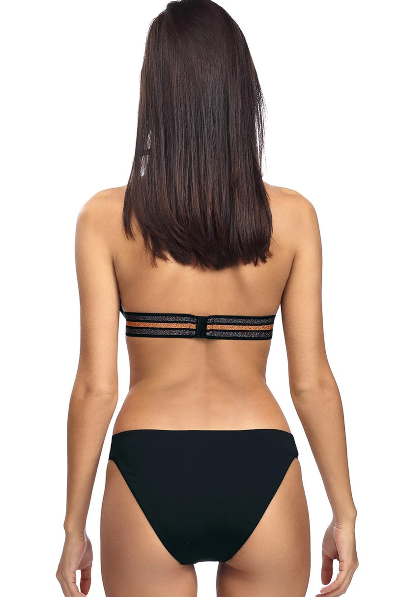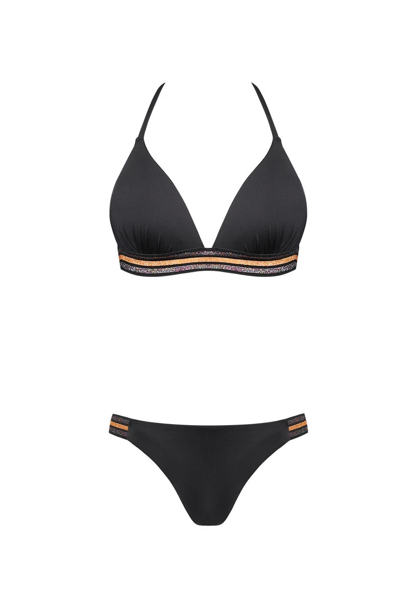 Svůdné dvoudílné plavky z řady Cosmo. Vyrobené z černé látky a lesklých gumiček. Podprsenka ve stylu bikin. Vyztužené košíčky s mírným tvarováním. zavazování za krkem a zapínání na zádech. doplněné kalhotkami s bočními ramínky