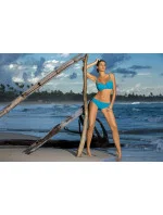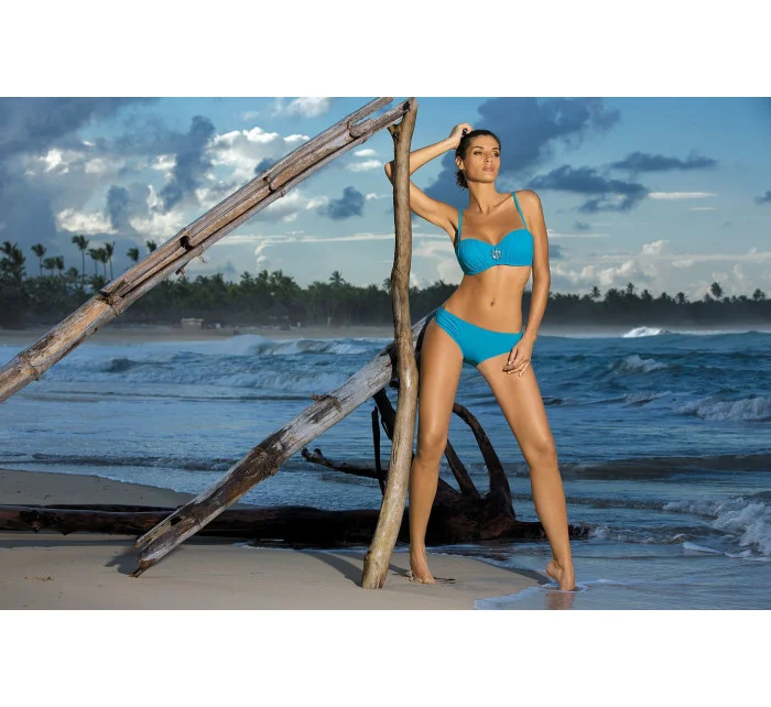 Elegantní a půvabné dvoudílné plavky ve sváteční barvě. Osvědčený design podprsenky velmi dobře tvaruje prsa - přibližuje je k sobě a díky push-up košíčkům je opticky zvětšuje. Díky vestavěným kosticím se prsa také pozvednou. Vycpané košíčky jsou zabalené do jednobarevné látky. Výraz doplňuje jemná řasa. Uprostřed šálků je výrazná brož s námořnickým motivem posetá zirkony (brož se zapíná na spínací špendlík a je odnímatelná). Podprsenka má odnímatelná, nastavitelná ramínka. Zapíná se na přezku.