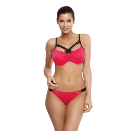 Je barevný, sexy, ženský a módní. Push-up podprsenka s vyztuženými košíčky a kosticemi, která profesionálně stahuje, tvaruje a opticky zvětšuje prsa. Dodává důvěru. Design je určen pro malé a střední poprsí, protože jim nejlépe vyhovuje. Push-up není z modelu odnímatelný a dodává se v každé velikosti plavek. Výstřih zdobený zajímavými černými elastickými pásky vypadá skvěle. Obvod pohodlně zavázaný na zádech, nastavitelná ramínka. Hladké kalhotky s elastickými pásky na bocích dělají nohy fenomenální a celou siluetu jednoduše nádhernou. Složení: 80 % polyamid, 20 % elastan.