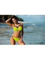 Je barevný, sexy, ženský a módní. Push-up podprsenka, s vyztuženými košíčky a kosticemi, profesionálně stahuje, tvaruje a opticky zvětšuje prsa. Dodává jim sebevědomí. Konstrukce je určena pro malá a středně velká prsa, protože jim nejlépe poslouží. Push-up se z modelu nedá vyjmout a je k dispozici v každé velikosti plavek. Výstřih zdobí zajímavé černé elastické pásky a vypadá skvěle. Pas se vzadu pohodlně zavazuje, ramínka jsou nastavitelná. Hladké kalhotky, s elastickými pásky na bocích, dělají nohy fenomenální a celá silueta je prostě nádherná.