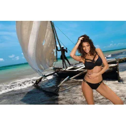 Je barevný, sexy, ženský a módní. Push-up podprsenka, s vyztuženými košíčky a kosticemi, profesionálně stahuje, tvaruje a opticky zvětšuje prsa. Dodává sebevědomí. Konstrukce je určena pro malá a střední prsa, protože jim nejlépe poslouží. Push-up se z modelu nedá vyjmout a dodává se v každé velikosti plavek. Výstřih zdobí zajímavé černé elastické pásky a vypadá skvěle. Pas se vzadu pohodlně zavazuje, ramínka jsou nastavitelná. Hladké kalhotky, s elastickými pásky na bocích, dělají nohy fenomenální a celou siluetu jednoduše skvostnou.