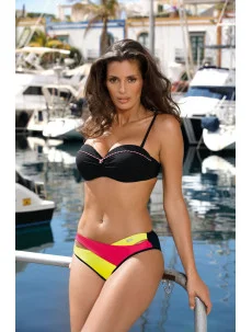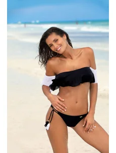 Podprsenka je hladká černá s dvojitými ramínky, zavazuje se za krkem a zapíná se na zádech. Vyztužená konstrukce s push-up a kosticemi okamžitě pozvedne a zvětší prsa, čímž vytvoří na pláži žádoucí ženský vzhled. Push-up se dodává ve velikostech S, M a L a je odnímatelný od podprsenky. Kalhotky mají stylová úzká ramínka, rovněž se zavazují, tentokrát na obou stranách boků. Plavky jsou vyrobeny z kvalitní italské látky.