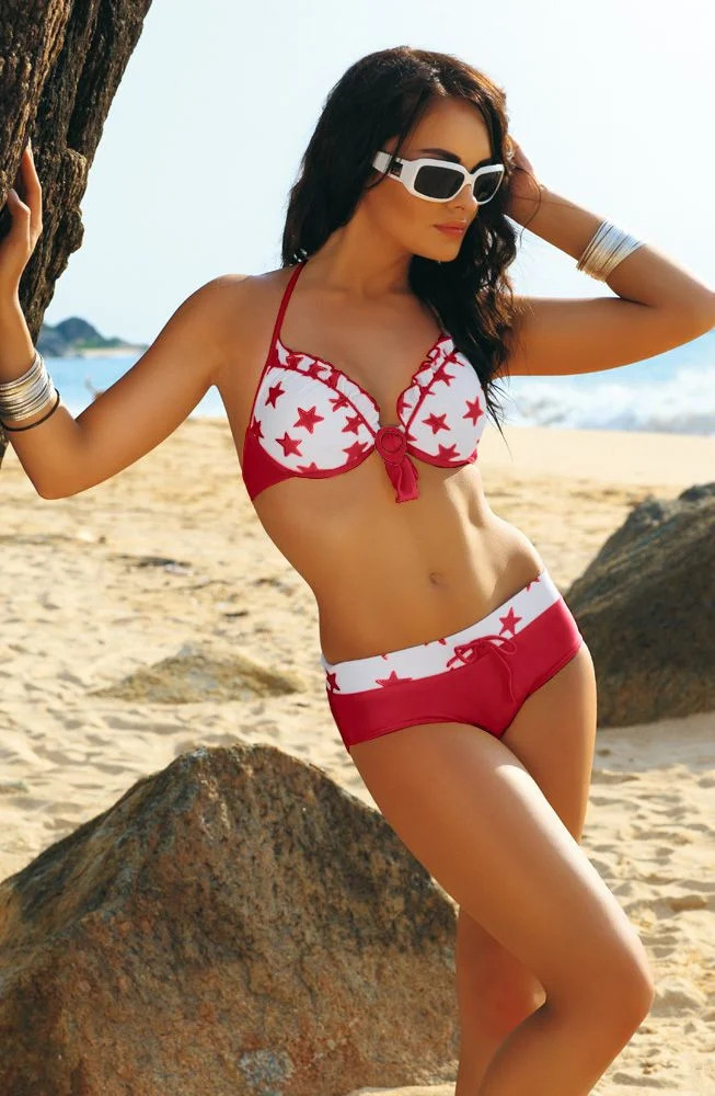 Sníte o pohodlí na pláži? Vyberte si plavky s push-up podprsenkou a šortkami! Zde je duo, které vám zajistí sexy vzhled a zároveň naprosté pohodlí na pláži. Podprsenku zdobí jemný, lehce lesklý vzor a šperková ozdoba uprostřed modelu. Jeho bílé pozadí dokonale zvýrazňuje opálení. Výstřih s jemným lemováním. Vyztužená konstrukce, na kosticích, s přiloženými push-up vycpávkami (vyjímatelné z podprsenky). Šortky jsou skvělou alternativou k tradičním spodkům. Složení: 80 % polyamid, 20 % elastan.