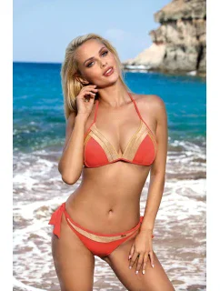Ten strój obdarzy Cię wyjątkowym wdziękiem (i do tego pozwoli zapomnieć o ewentualnych kompleksach). Ma świetny fason. Został stworzony na małe i średnie biusty - dobrze zbiera, modeluje i unosi piersi, znacząco je powiększając. Dekolt nabiera gracji, seksapealu, a Ty maksimum kobiecości. Jego sekret? - to miseczki usztywniane delikatną pianką, z fiszbinami i dość dużym wypełnieniem push up, które tym razem umieszczono na stałe wewnątrz biustonosza. Falbana na dekolcie to jeden z najbardziej topowych trendów lata. Ramiączka o regulowanej długości, obwód wiązany na plecach. Do tego zalotne figi, typu biodrówki, również z falbaną. Kostium uszyto z pięknej, włoskiej tkaniny Carvico Fabrics, a dostępny jest w wielu atrakcyjnych, plażowych kolorach. Wybierz go w swoim ulubionym!