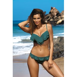 Ten strój obdarzy Cię wyjątkowym wdziękiem (i do tego pozwoli zapomnieć o ewentualnych kompleksach). Ma świetny fason. Został stworzony na małe i średnie biusty - dobrze zbiera, modeluje i unosi piersi, znacząco je powiększając. Dekolt nabiera gracji, seksapealu, a Ty maksimum kobiecości. Jego sekret? - to miseczki usztywniane delikatną pianką, z fiszbinami i dość dużym wypełnieniem push up, które tym razem umieszczono na stałe wewnątrz biustonosza. Falbana na dekolcie to jeden z najbardziej topowych trendów lata. Ramiączka o regulowanej długości, obwód wiązany na plecach. Do tego zalotne figi, typu biodrówki, również z falbaną. Kostium uszyto z pięknej, włoskiej tkaniny Carvico Fabrics, a dostępny jest w wielu atrakcyjnych, plażowych kolorach. Wybierz go w swoim ulubionym!