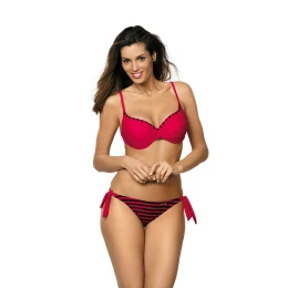Hladká, nadčasová podprsenka s ozdobným lemováním kolem výstřihu a sexy kalhotkami, které se zavazují na obou stranách boků, tentokrát v módních pruzích. Plavky Maya M-359 jsou rozhodně hitem sezóny!