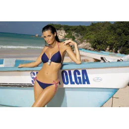 Prześliczne bikini w letnim kolorze, który wspaniale współgra z opalenizną. Biustonosz to tradycyjne trójkąty na sznureczkach. Dół miseczek delikatnie marszczony. Zewnętrzna krawędź biustonosza obszyta została lamówką w paseczki. Uroku dodaje umieszczona między miseczkami kokieteryjna broszka ozdobiona białą tkaniną w czarne groszki. Miseczki są usztywnione, doskonale wyprofilowane i zapewniają pełen komfort noszenia.W zestawie majteczki wiązane na biodrach. Przód miętowy, utrzymany w pastelowej tonacji. Tył gładki.• produkt najwyższej jakości, potwierdzony hologramem,• uszyty z włoskiej tkaniny Carvico Tessuti,• odporny na działanie promieni słonecznych i siłę trącą piasku,• doskonale kryjący ciało,• szybkoschnący.