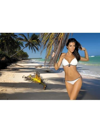 Nádherné bikiny v letní barvě, která se skvěle hodí k vašemu opálení. Podprsenka je tradiční trojúhelník na šňůrkách. Spodní část košíčků je jemně nařasená. Vnější okraj podprsenky je lemován pruhovaným lemováním. Půvab dodává koketní brož umístěná mezi košíčky a zdobená bílou látkou s černými puntíky. Košíčky jsou vyztužené, dokonale tvarované a poskytují plný komfort při nošení.Součástí jsou kalhotky zavazované na bocích. Mátová přední strana, udržovaná v pastelových tónech. Hladká záda.- nejvyšší kvalita výrobku, potvrzená hologramem,- ušité z italské tkaniny Carvico Tessuti,- odolné vůči slunečním paprskům a síle tření písku,- dokonale kryjící tělo,- rychleschnoucí.