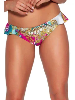 Kalhotky, tentokrát bez zavazování na bocích, jsou klasičtější, se zcela hladkým zadním dílem (červeným, stejně jako ramínka). Svůdným způsobem zvýrazňují linii boků.
