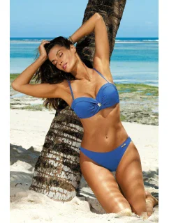 Esence modré barvy plus jemný hrášek... Miranda je ideální volbou na pláž. Hladké, vyztužené košíčky s kosticemi, zvýrazněné vzorovaným lemováním. Jemné řasení dodává koketnost. Konstrukce příjemně shrnuje a přibližuje prsa k sobě. Velikosti S, M, L mají navíc (vyjímatelnou) push-up výplň, která ponechaná v podprsence sexy zvětšuje velikost prsou. Podprsenka se pohodlně zavazuje za krkem i na zádech.