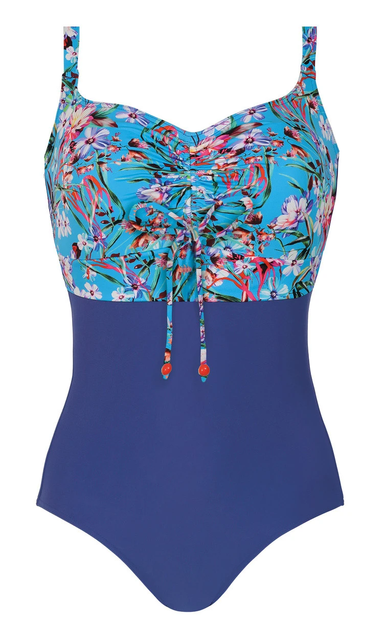 Jednodílné plavky ze vzorovaného barevného mikrovlákna, spodní linie a záda pevná. Vyztužené košíčky, mezi nimi zavazování. Nastavitelná, neodnímatelná ramínka.