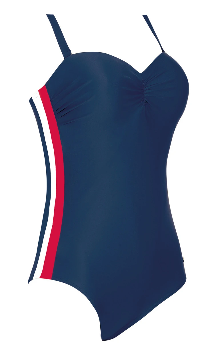 Jednodílné plavky z mikrovlákna. Vyztužené košíčky s jemným řasením. Nastavitelná ramínka, odepínatelná pouze vpředu, což poskytuje pohodlí při opalování.