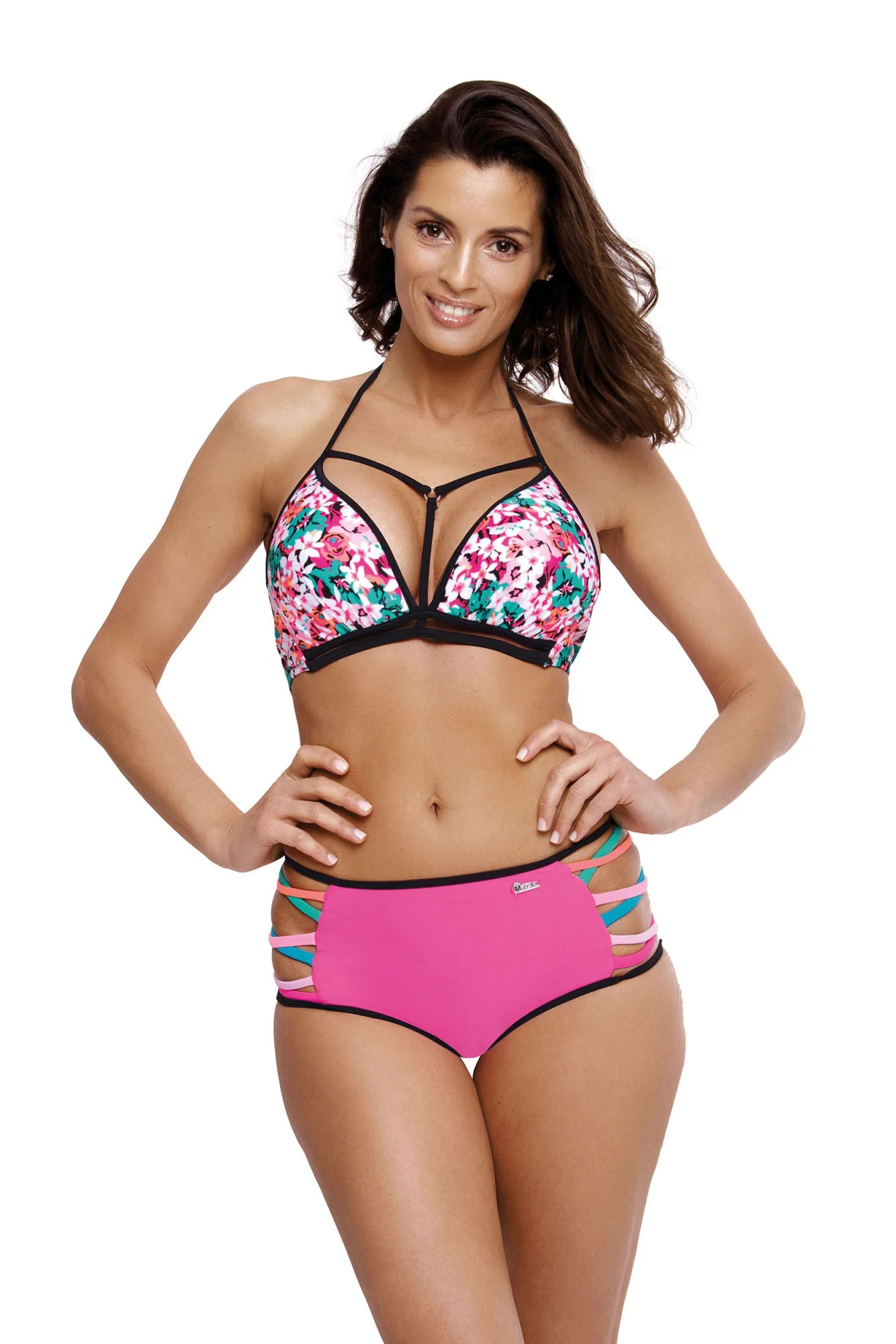 Černá elastická ramínka ve výstřihu, ozdobné lemování pod poprsím, proužky na bocích, květy a vysoký spodní díl s nízkým sedem, který vám zaručí naprosté pohodlí, a to není všechno... Podprsenka má vyztužené košíčky s push-upkou, díky které můžete pěkně shrnout a vytvarovat svá ňadra a krásně je prezentovat ve výstřihu. Push-upka je v modelu umístěna napevno, z plavek se nevyjímá a je v každé velikosti. Podprsenka se zavazuje jako bikiny - na zádech a za krkem. Květinový vršek pěkně doplňuje hladký spodní díl. Krásné barvy a italská látka nejvyšší kvality. To je ono!