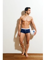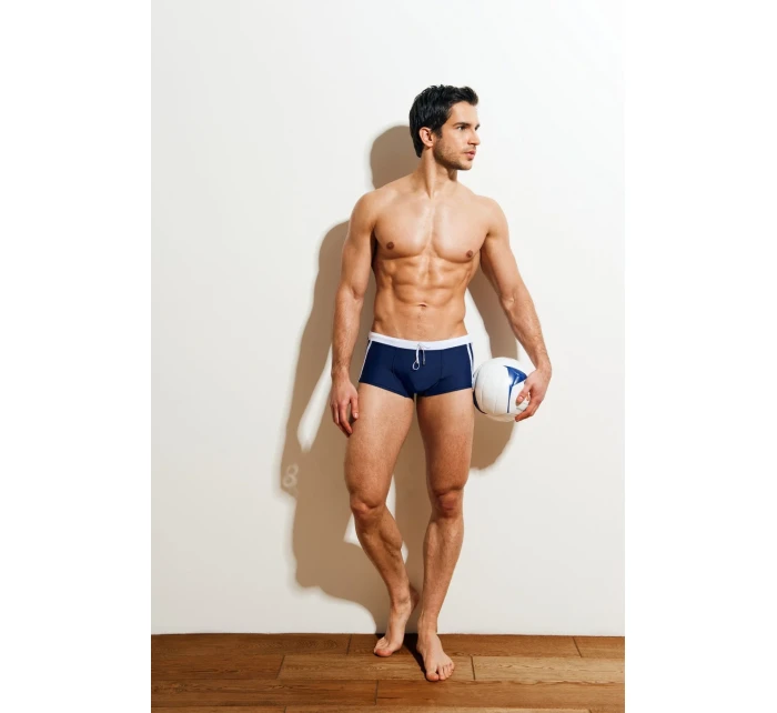 Námořnicky modré a bílé sexy pánské plavky. Krátké nohy se svislými dvojitými pruhy vypadají velmi dobře a odkazují na sportovní charakter. Bílé lemování v pase zvýrazní vaše opálení. V horní části je umístěna gumička a provázek, pomocí kterých si můžete nastavit napětí přesně podle svých potřeb. Jedna z nejlepších nabídek výrobce. Cítit se dobře na pláži!