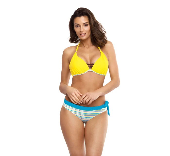 Biustonosz z trójkątnymi miseczkami usztywnianymi specjalną pianką, wzbogacony push-up-em - dzięki niemu piersi uniosą się i optycznie powiększą, tworząc zmysłowy, głęboki dekolt. Push-up umieszczony jest w kostiumie na stałe i nie jest wyjmowany z modelu, występuje w każdym rozmiarze kostiumu. Biustonosz zwraca także uwagę modnym dodatkiem w postaci "pasków-gumek" umieszczonych przy dekolcie. Ładne ramiączka wiązane na szyi, zdobione delikatną, biżuteryjną ozdobą (można ją zdjąć), będą atrakcyjnie prezentować się w promieniach słońca. Majteczki o doskonałym kroju "midi" - o wyśrodkowanej wysokości. Są wzorzyste i ozdobnie wiązane na boku (klasyczny, wkładany krój). Skład: 80% poliamid, 20% elastan.