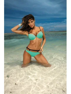 Hladké dvoudílné plavky se vzorovaným lemováním a skvělými barvami. Velmi ženské. Košíčky podprsenky byly profesionálně vymodelovány a vyztuženy - dobře sbírají prsa, zvedají je a díky podšití a push-up výplni je ještě opticky zvětšují. Hluboký výstřih - mírně prohloubený, ale stále velmi elegantní a vyvážený. Ramínka jsou nastavitelná. Pásek se tentokrát pohodlně zavazuje na zádech. Kalhotky se zavazují na bocích. Plavky vypadají opravdu skvěle a zajistí vám naprosté pohodlí na pláži.