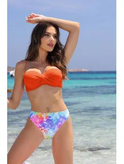 Zajímavé mozaikové plavky ve slunečných barvách. Dvoudílné plavky s podprsenkou, která pozvedne, vytvaruje a zvětší prsa, a klasickým spodním dílem. V těchto plavkách se jistě budete otáčet. Vyztužené bardotové košíčky s push-upkou okamžitě pozvednou a vytvarují prsa. Push-upka je odnímatelná. Ramínka podprsenky jsou odnímatelná. Spodní díl skvěle doplňuje komplet. 82 % polyamid, 18 % elastan.