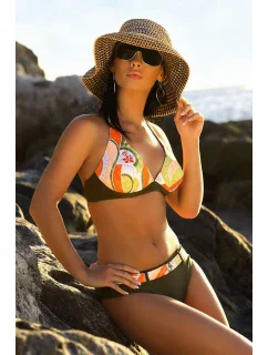 Mimořádně pohodlné dvoudílné plavky ze vzorované látky. Košíčky s kosticemi v měkké konstrukci, pěkně sbírají prsa z boků, nadzvedávají je a svůdně tvarují ve výstřihu. Ramínka a obvod jsou zavazovací. Kalhotky s kosticemi na přední straně, hladké, s ozdobným páskem kolem boků. 82 % polyamid, 18 % elastan.