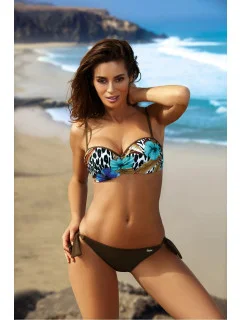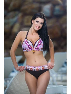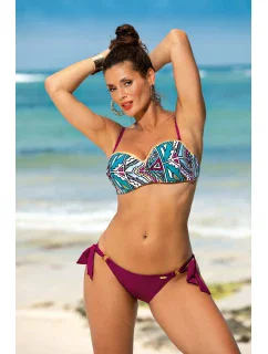 Tyto dvoudílné plavky jsou barevné a velmi sexy. Podprsenka má vyztužené košíčky s kosticemi a push-up a její střih připomíná známý a oblíbený bardot. Umně shromažďuje a zvedá prsa, čímž je opticky zvětšuje. Push-up je součástí každé velikosti plavek a není z modelu odnímatelný. Ramínka bez ramínek lze z modelu zcela odepnout. Zavazování na zádech umožňuje dokonalé přizpůsobení plavek. Kalhotky s ozdobným zavazováním na bocích, s klasickým, vkládacím, velmi pohodlným střihem. Složení: 80% polyamid, 20% elastan.