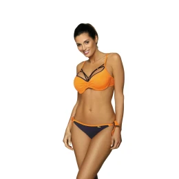 Podprsenka s vyztuženými košíčky, kosticemi a push-up výplní, trvale zabudovaná do modelu. Skvěle pozvedne prsa, vytvaruje je a svůdně zvětší, jak je vidět na fotografii. Ramínka (elastické pásky) jsou pružná, se zlatými šperky a mega módní. Dodávají jim skutečný sex-appeal, který si můžete na pláži směle dopřát. Nastavitelné, neodnímatelné ramenní popruhy. Elastický pásek, zavázaný na zádech. Spodní díl bikin brazilského střihu s vysokým vykrojením na hýždích - sexy a ideální na opalování. Pro dosažení plného brazilského efektu by měly být kalhotky výrazně vytažené nahoru směrem k bokům. Pohodlné úvazy na bocích. Ps. Kalhotky mají v zadní části dodatečné řasení na látce, které opticky smyslně zaobluje zadeček.