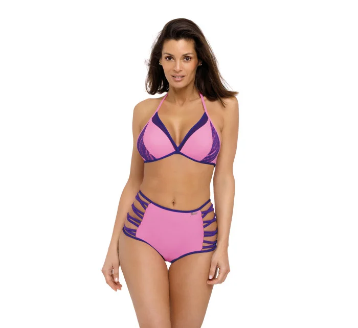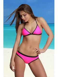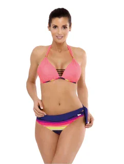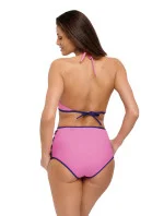 Podprsenka se pohodlně zavazuje za krkem a na zádech a má vyztužené košíčky s push-up vložkou, takže prsa jsou dokonale shrnutá, pozvednutá a zvětšená (push-up vložka je součástí každé velikosti plavek a z modelu se nevyjímá). Dekolt je z hladkého černého tylu a košíčky mají vsadku z látky imitující smyslnou krajku. Kalhotky jsou opravdovým hitem - jsou vyšší, a proto velmi pohodlné, navíc maskují bříško a díky bočním ramínkům vypadají stále žensky a svůdně. Italská látka, krásné barvy na výběr, stojí za to.