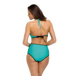 Podprsenka se pohodlně zavazuje za krkem a na zádech a má vyztužené košíčky, které jsou obohacené o push-up, takže prsa jsou dokonale shromážděná, pozvednutá a zvětšená (push-up výplň je přítomna v každé velikosti plavek a není z modelu vyjímatelná). Ve výstřihu je výstřih z hladkého černého tylu. Na košíčcích je vsadka z látky imitující smyslnou krajku. Kalhotky jsou skutečným hitem - jsou vyšší, a proto velmi pohodlné, navíc zakrývají bříško a díky elastickým páskům na bocích vypadají stále žensky a svůdně. Italská tkanina, krásné barvy na výběr. Nechte se zlákat, protože to stojí za to. Složení: 80 % polyamid, 20 % elastan.