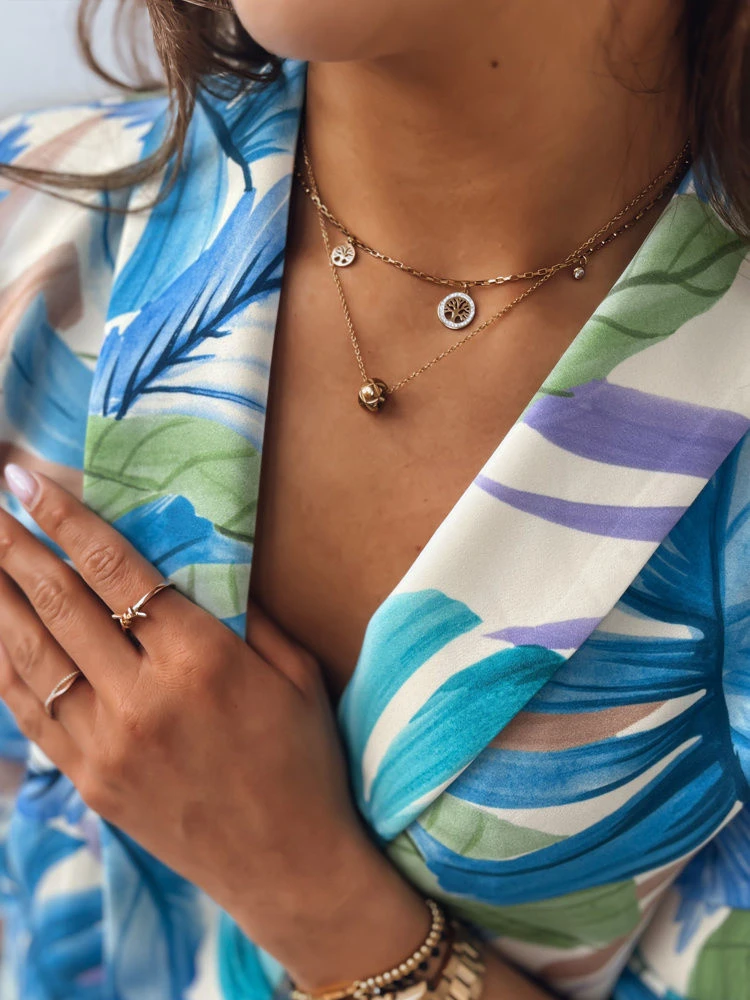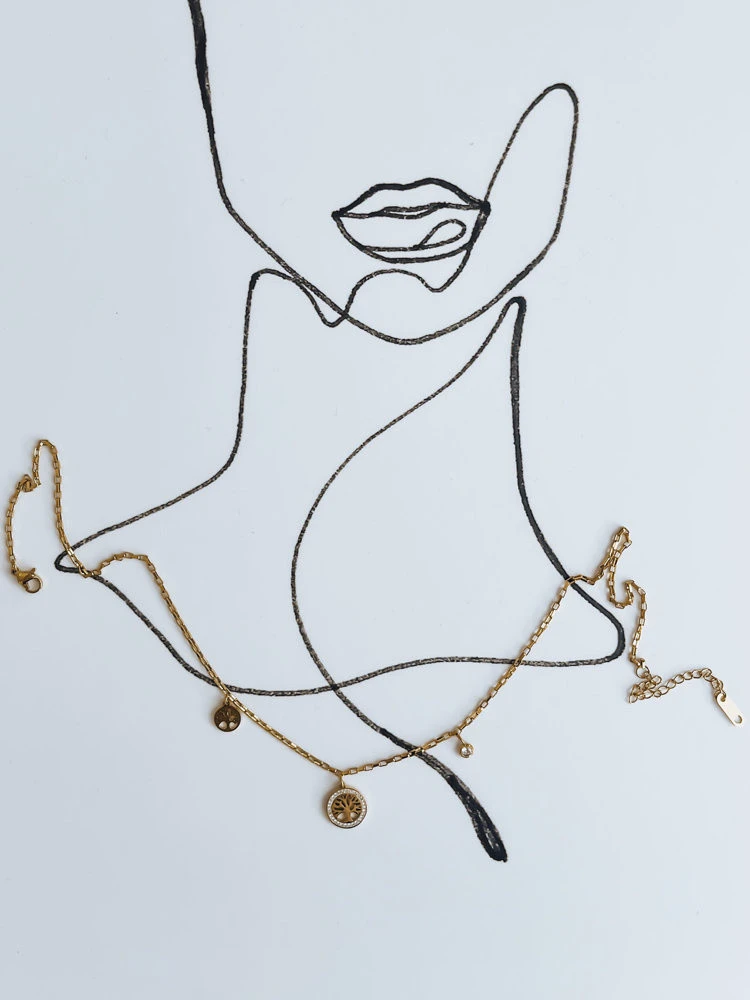 Mimořádně jemný návrh ve zlaté barvě zpestřený přívěsky, mezi nimiž je v čele "strom štěstí" obklopený drobnými diamanty. Má zapínání s nastavitelnou délkou.