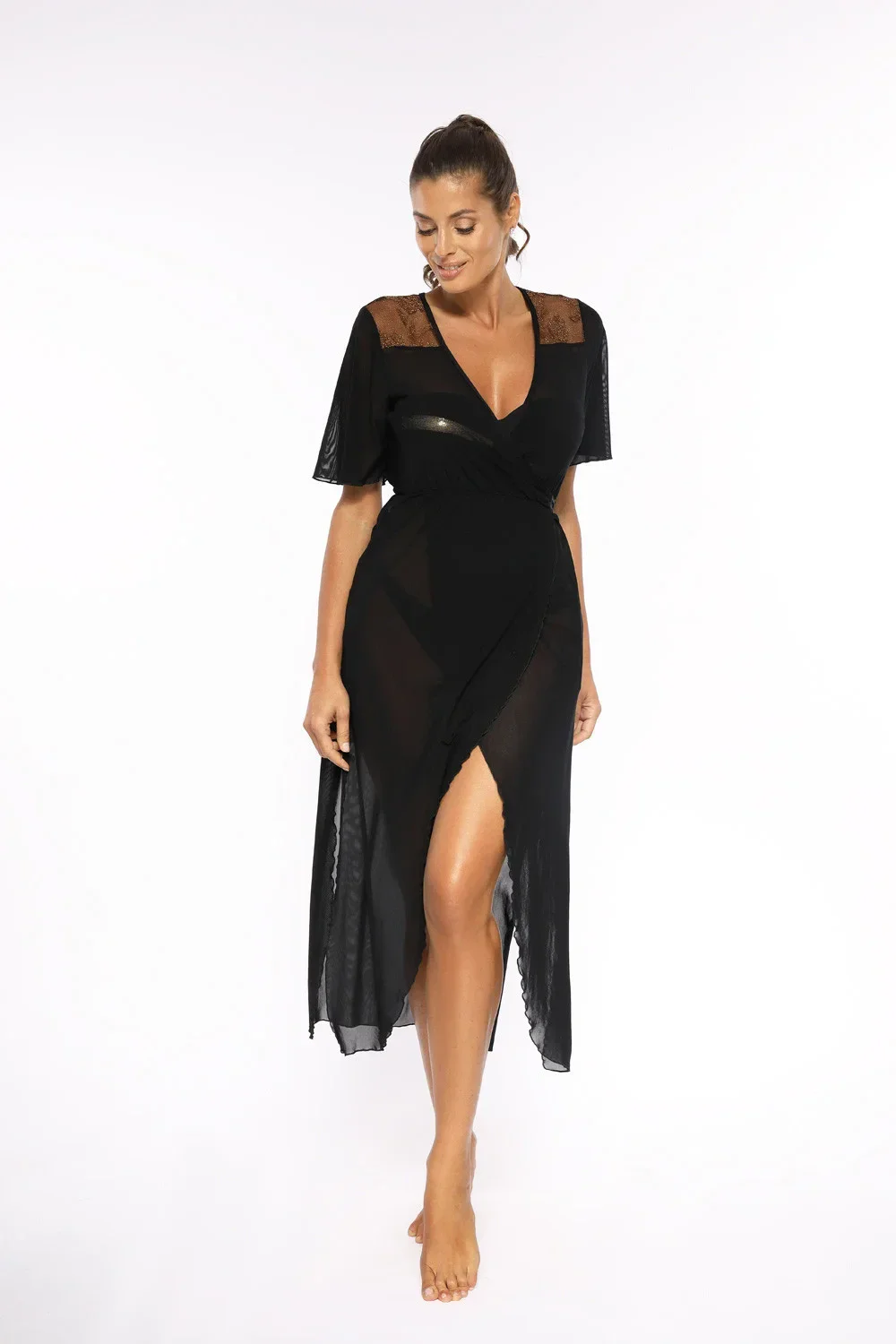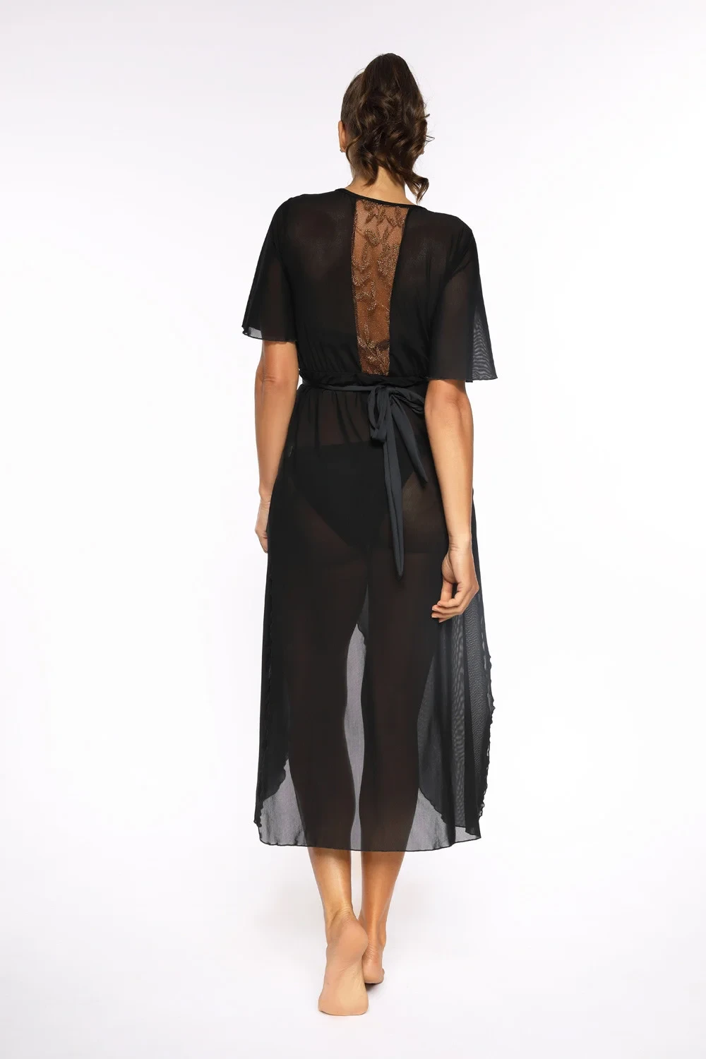 Působivá černo-zlatá dlouhá tunika, která obepíná tělo jako mlha. Fenomenální dlouhá tunika převázaná mašlí. Vyrobeno z mírně průhledné, průsvitné italské tkaniny. Model s krátkými rukávy. Ramena a záda jsou zakončena krajkou v barvě starého zlata. Tunika má také dodatečné vázání skryté na vnitřní straně tuniky, díky němuž celý střih působí smyslně, luxusně a sexy. K dispozici v mnoha krásných plážových barvách.