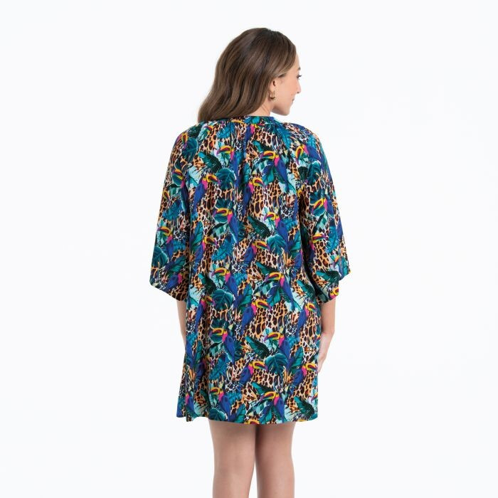 Přeneste se na prosluněnou pláž nebo k bazénu v naprostém stylu. Tunikové šaty Anita Manihi z exkluzivní série „Tropic Splash“ jsou mistrovským spojením dvou světů – divoké džungle a osvěžující laguny. Dominantní tropický potisk „Aloha“ v hlavním těle šatů dokonale doplňují kontrastní lemy s tyrkysovým leopardím vzorem na rukávech a spodním okraji.