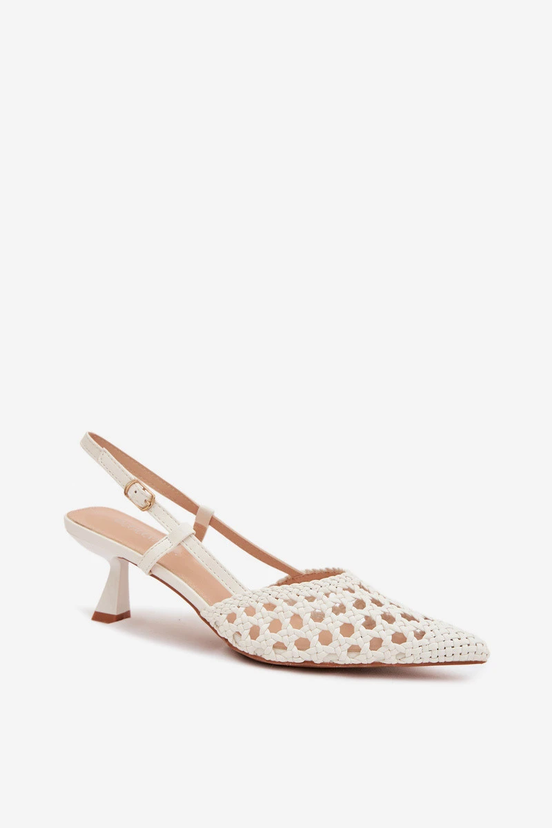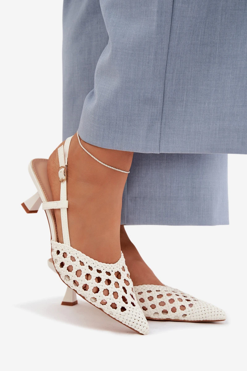 Dámské sandály vyrobené z dekorativního pletení jsou stylovým tipem na teplejší dny. Uzavřené, špičaté nosy zdůrazňují jemnou linii nohy a dodávají obuvi elegantní charakter. Model na tenkém podpatku jemně zeštíhluje siluetu, zajišťujíc ženský vzhled. Zapínání na přezku umožňuje přizpůsobení noze, zvyšuje pohodlí a stabilitu při chůzi. Tyto elegantní sandály skvěle doplní letní outfity – jak na každodenní nošení, tak na výjimečné příležitosti. Při výběru velikosti se řiďte tabulkou velikostí.
