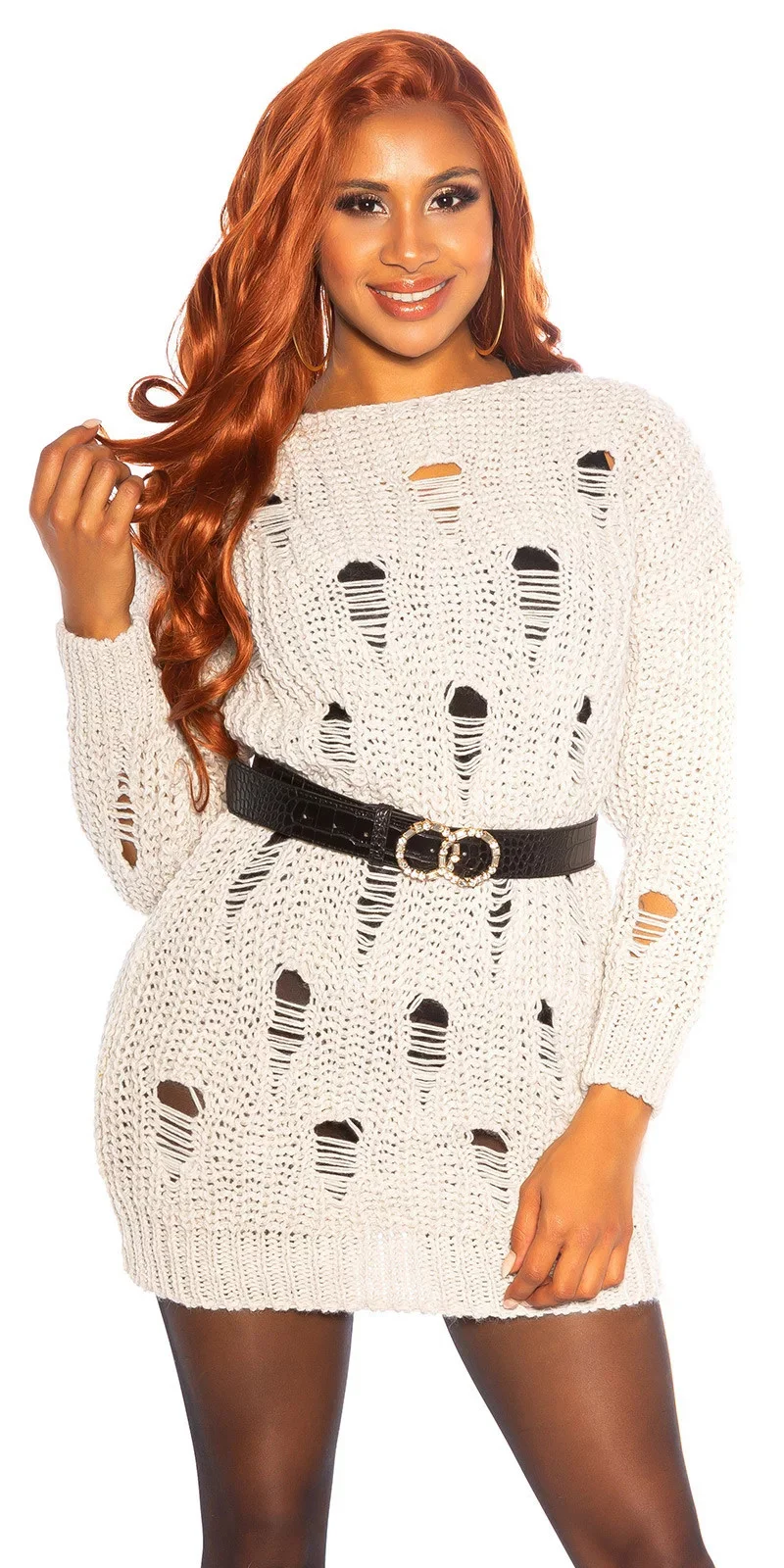 Dámský hrubý svetr ve světle šedé barvě. Délka pod zadek, dlouhé rukávy. Vepředu vetkané díry.