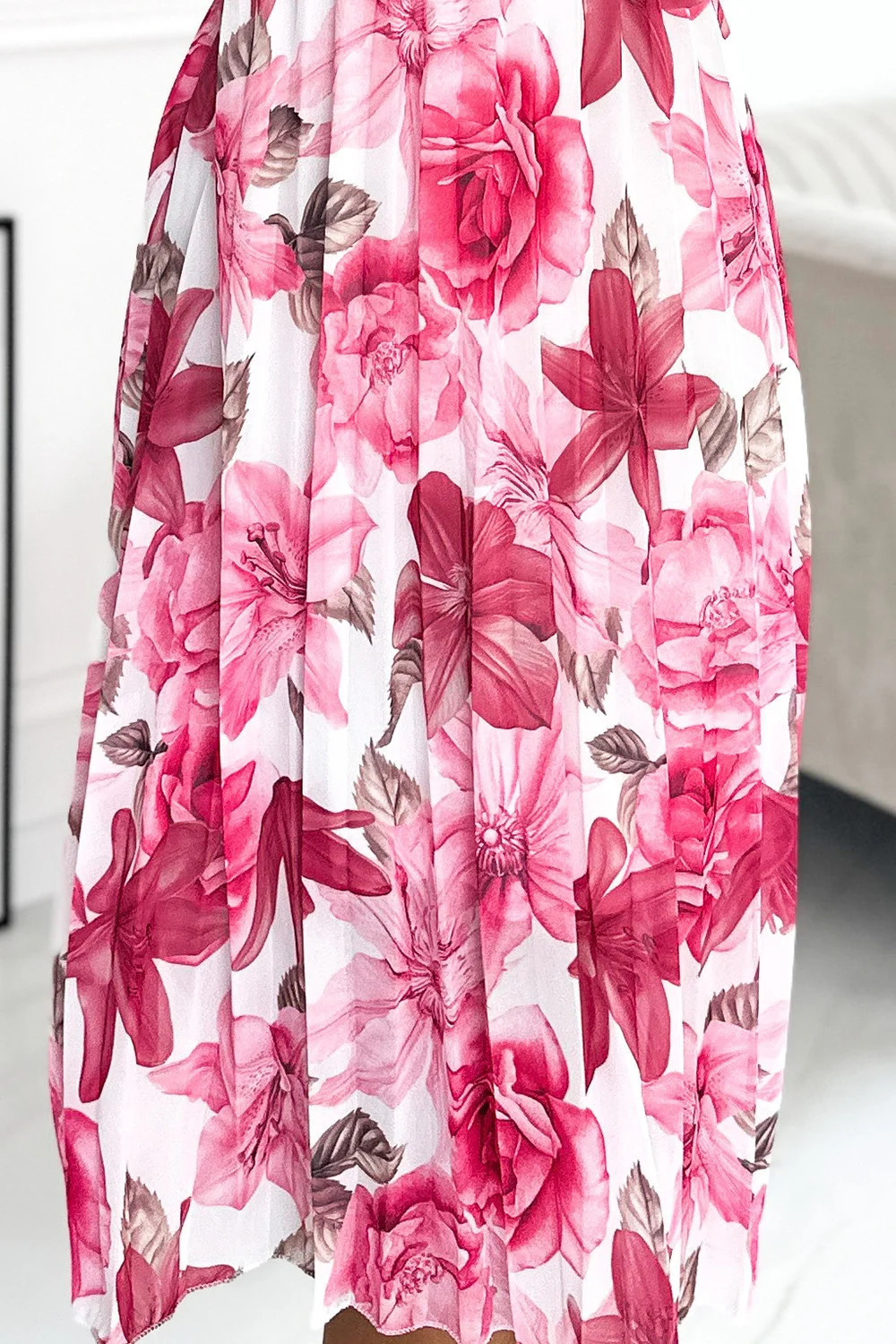 Tyto šaty značky Numoco jsou evropským výrobkem a jsou k dostání se vzorem tmavě růžových květů na bílém pozadí.