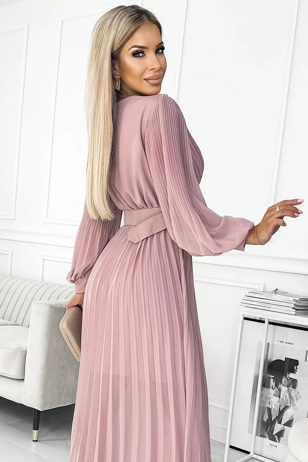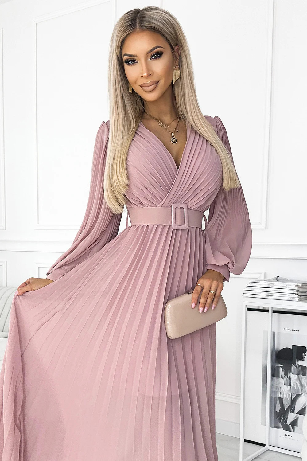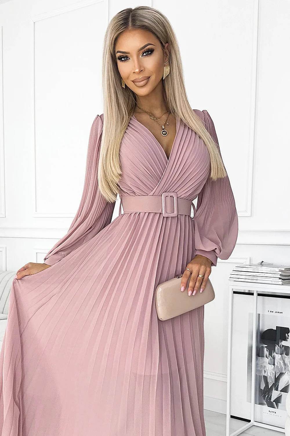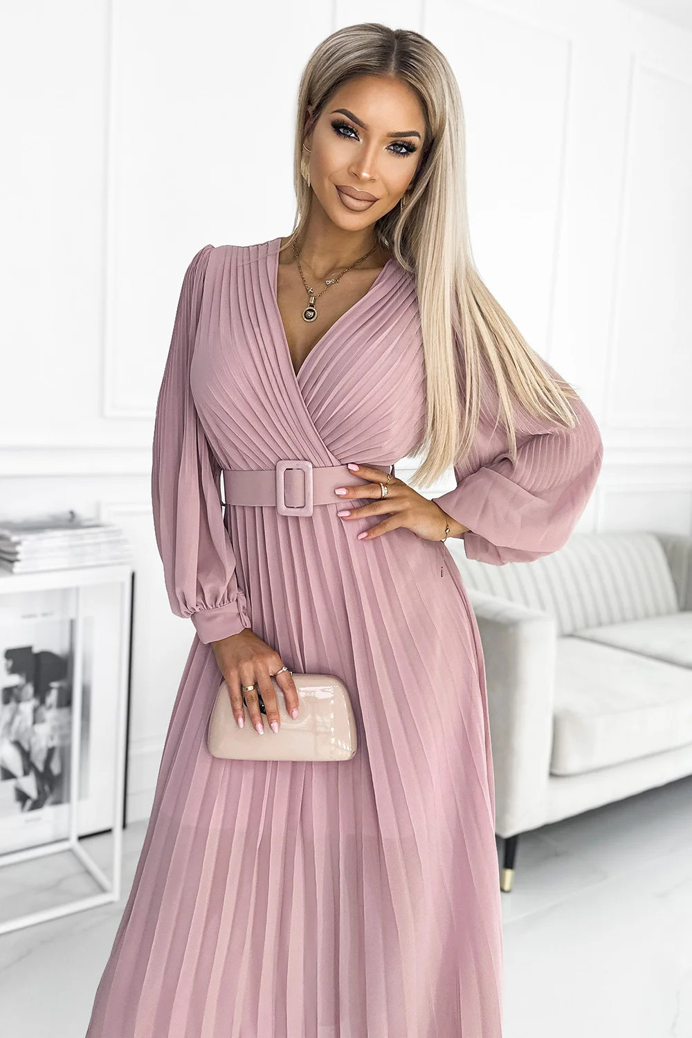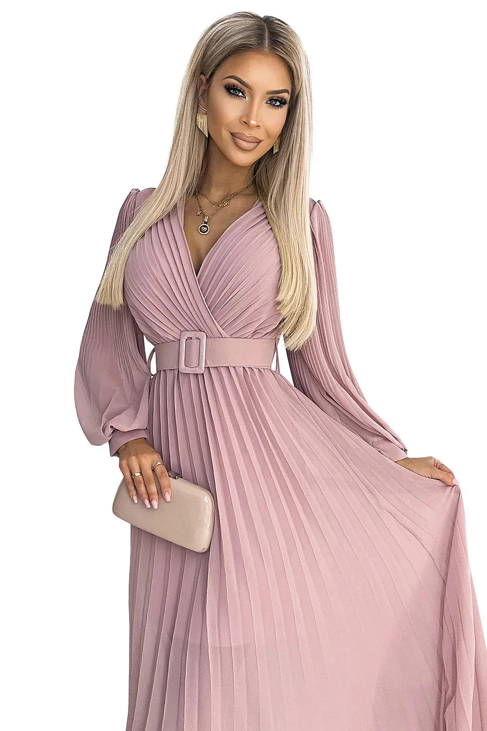 Klara - plisované šifonové šaty s výstřihem, dlouhým rukávem a páskem. plisování na výstřihu a rukávech dodává šatům eleganci. barva: pudrově růžová. značka numoco.