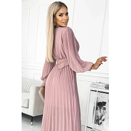 Klara - plisované šifonové šaty s výstřihem, dlouhým rukávem a páskem. plisování na výstřihu a rukávech dodává šatům eleganci. barva: pudrově růžová. značka numoco.