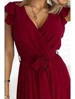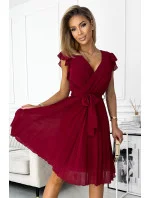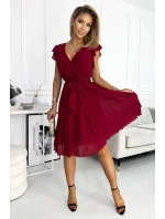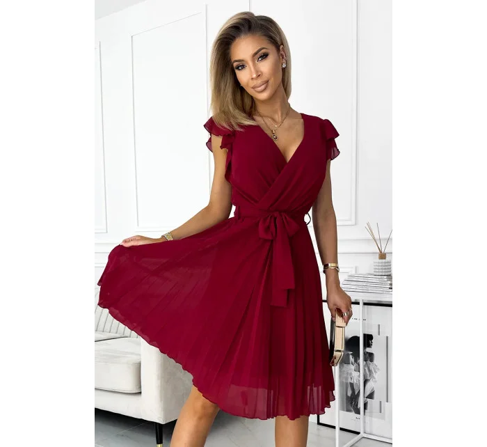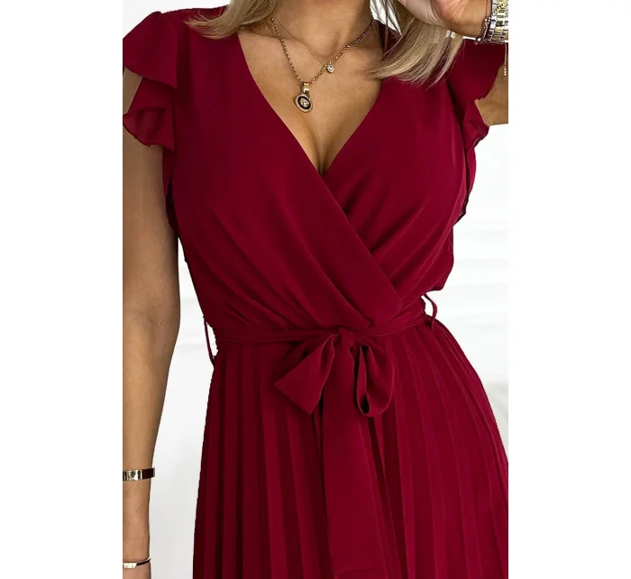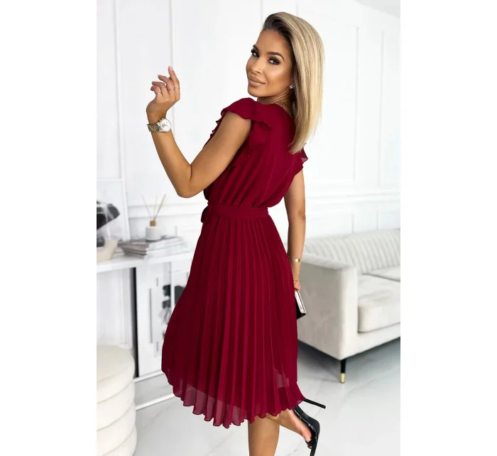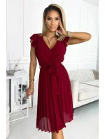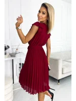 POLINA - Dámské plisované šaty ve vínové bordó barvě s výstřihem a volánky 374-2